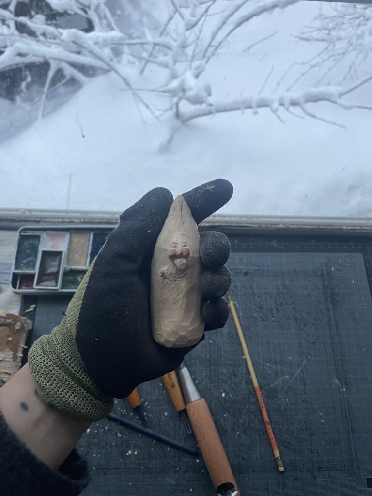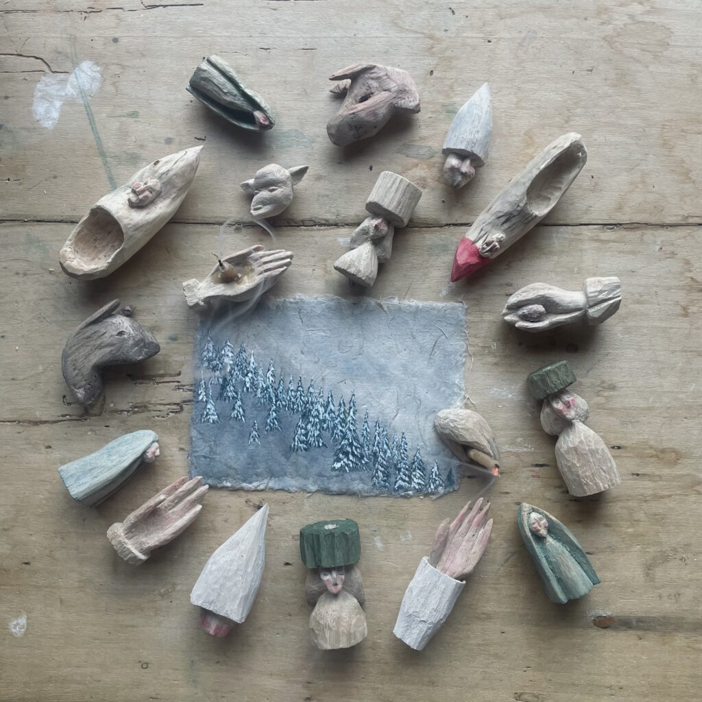 旅先のトルコやジョージアで、驚くような木彫に沢山出会った。宗教美術に骨抜きになった。「私は、これを、アミニスム的にやりたい」と、思った。だから帰国してすぐに木を彫り始めた。木を彫る事は、インスタントに欲求を満たせない。一日がかりで向き合い、親指サイズの小さな木のかけらから表情が生まれてくる。でも木の質感、私が消えても全て森にばら撒いてしまっても問題ないというような仕舞いの良さ、そういう点で、長い間葛藤してきた表現に対する一つの答えだった。